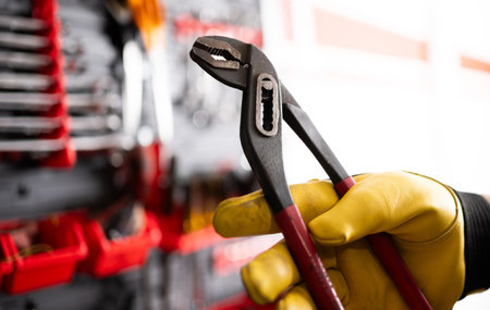 Auto Mechanic With Pliers Against Tool Wall In Service Center