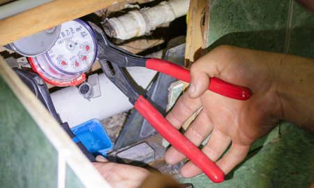hands of a plumber in the process of work, replacement of pipes, plumbing service, adjustable wrench