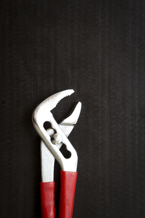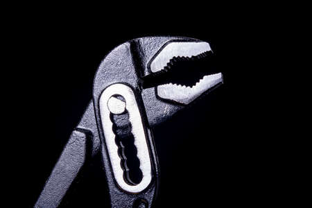 Adjustable wrench used in installation work. Accessories for plumbers. Dark background.