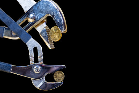Allegory of the global financial crisis - Iron 10 rubles coin (written ten rubles, Bank of Russia in the Russian) in the grip of economic crisis, on a black background. Finance and business concept