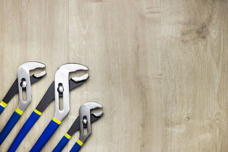 Three adjustable pliers on wood background. Adjustable wrenches.