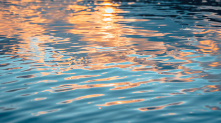 A tranquil image of gentle water surface reflecting soft sunlight, creating serene ripples and calming patterns that evoke peace and relaxation during golden hour.