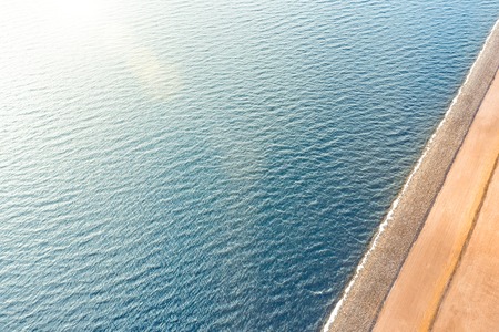 Border between sea and land. Stones mound of sand and water, top aerila view, sun shine glare