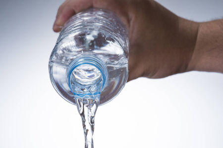 A man holds a plastic bottle of drinking water in his hand