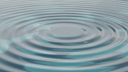 A drop of water is falling into a large body of water. The water is calm and still, with ripples forming around the drop. Concept of tranquility and peace