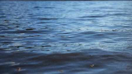 Close up view on lake with small waves at sunny day. Calm scenery of pond at summer season. Beautiful nature landscape. Concept of tranquility scene. Slow motion