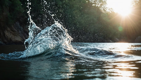 Golden hour sunlight reflecting on a flowing river surface