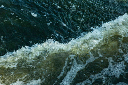 Waves of water of the river and the sea meet each other during high tide and low tide. Deep blue stormy sea water surface with white foam and waves pattern, background photo texture