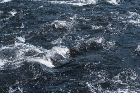 Rapidly flowing river with dark blue water, foam. Rapids river flow, sparkling in sun. Photo and texture blue water in summer. Section river with fast flow and steep channel. Horizontal photo.