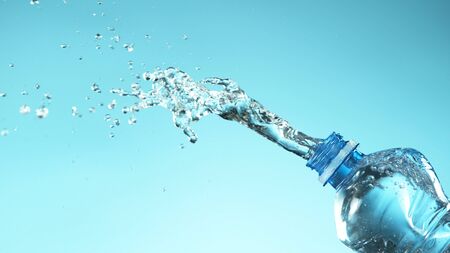 Exploding fresh water from plastic bottle on soft blue