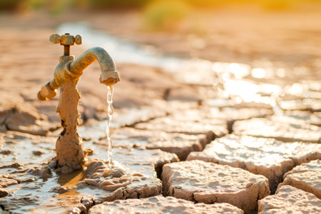 Water drips from a rusted tap standing lonely over parched, cracked earth as the sun sets, casting a warm glow over the desolate landscape and highlighting the severity of drought conditions.