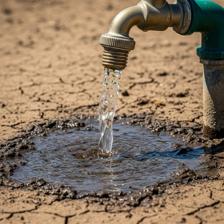 A faucet leaks water onto a dry, cracked earth, symbolizing the urgent issue of water scarcity and environmental challenges in a parched landscape.