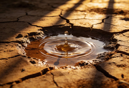 A single, precious drop of water falls onto the parched, cracked earth, creating a ripple in a tiny puddle.