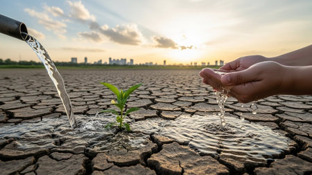A closeup photograph of human hands cupping and pouring water onto parched, cracked earth in a dry landscape, illuminated by warm sunlight, showing water scarcity.