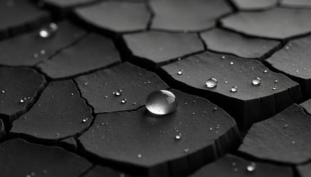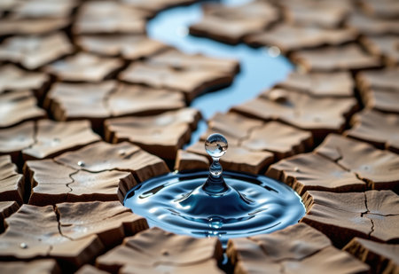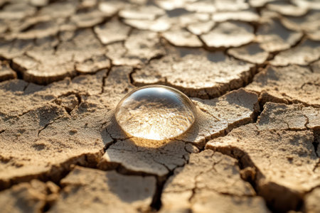 A lone droplet of water sits on a broken piece of arid land, creating a contrast in textures and highlighting the scarcity of moisture in the surroundings