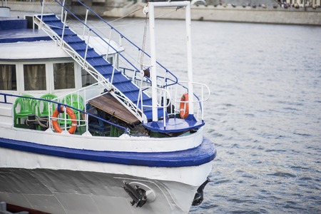 Ship on the Volga River in Nizhny Novgorod, Russia. View from the funicular from the cable car.