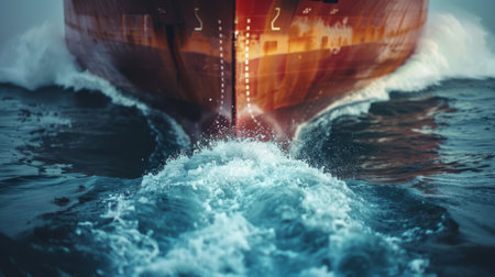 Powerful Vessel Cuts Through Ocean Waves in Early Morning Light, Showcasing Maritime Strength and Movement in Tranquil Waters. Generative AI