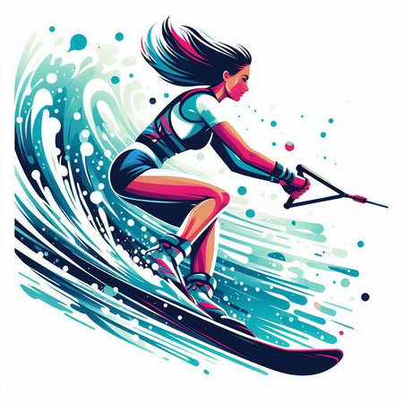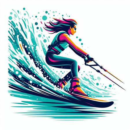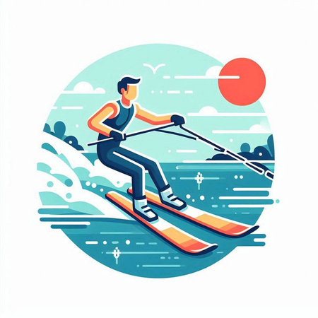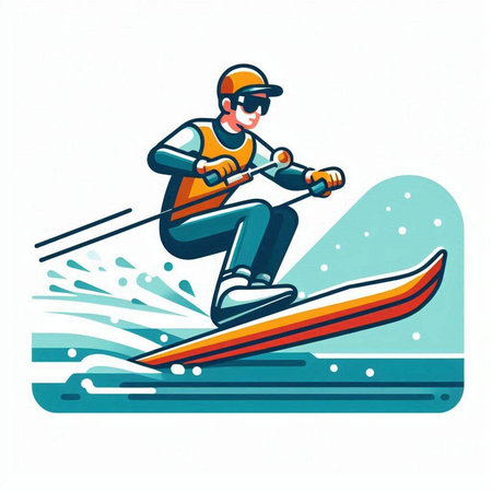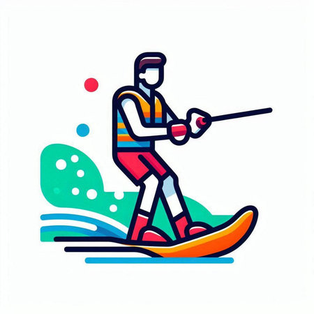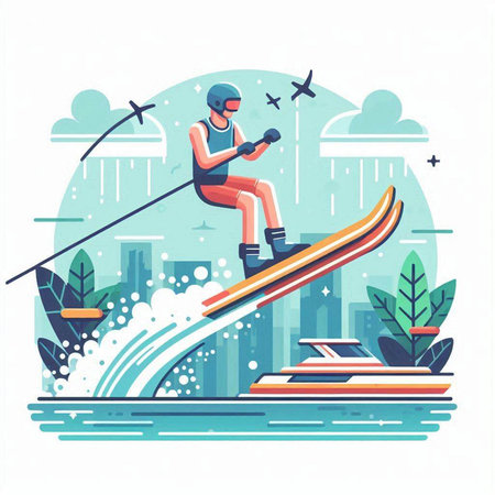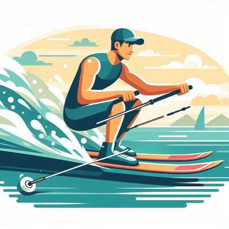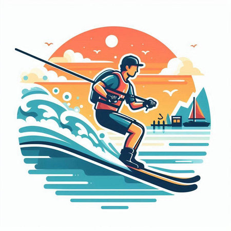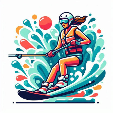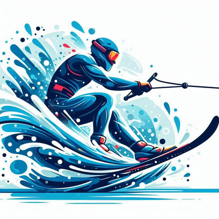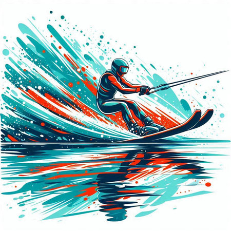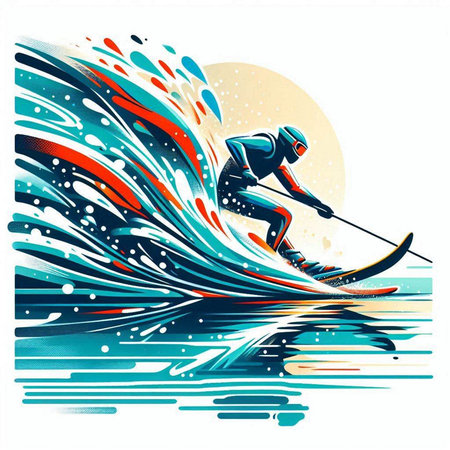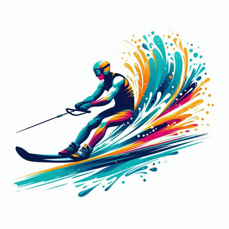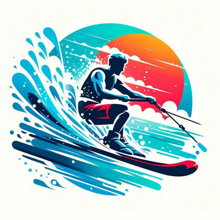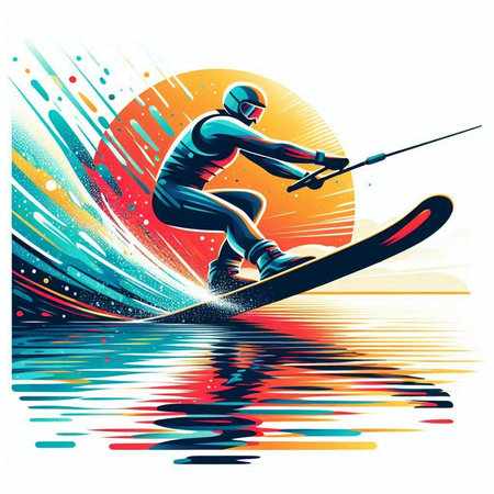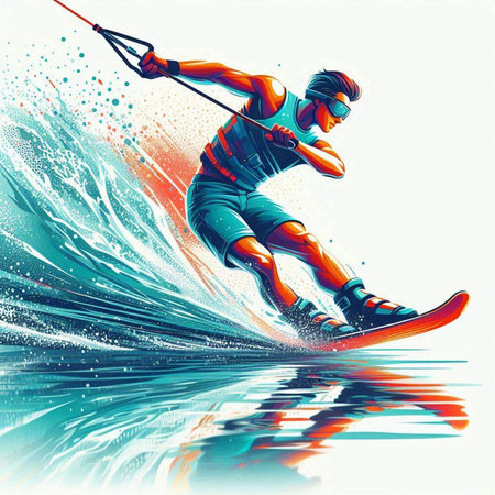 colorful illustration of a man wakeboarding in the water with splashes