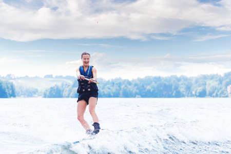 Young pretty slim brunette woman riding wakeboard on wave of motorboat in a summer lake
