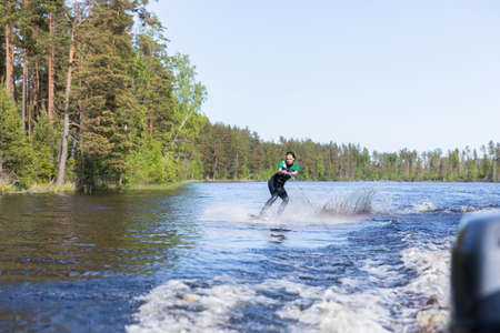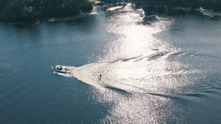 Speedboat towing an athlete on a Board against the background of the forest. Athlete water skiing and having fun. Speed boat for Surfing the Wakeboard. Water skiing on lake behind a boat. Top view