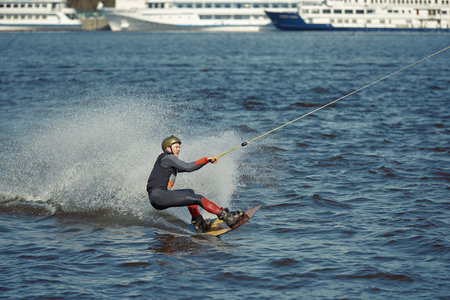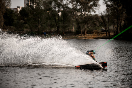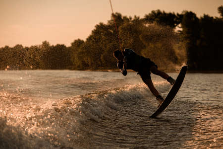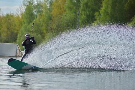 beautiful view of splashing water on which active young man rides on wakeboard