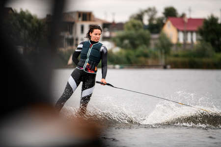 Young pretty slim brunette woman in wetsuit riding wakeboard on wave of motorboat in a summer lake