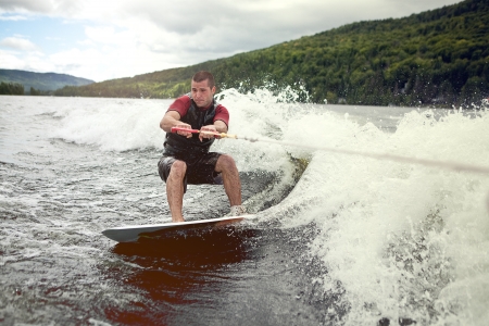 Young man riding wakeboard on a summer lake