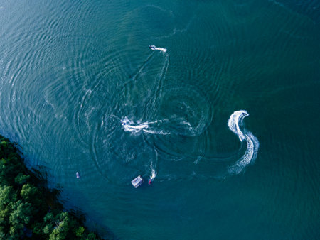 Aerial view from a drone of people who ride a jet ski on the water
