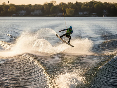 A captivating close-up shot showcasing a person wakeboarding over water, emphasizing action, excitement, and the thrill of summer sports.