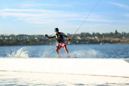 Athletic man in vest balances on wakeboard on the water holding hands on cable
