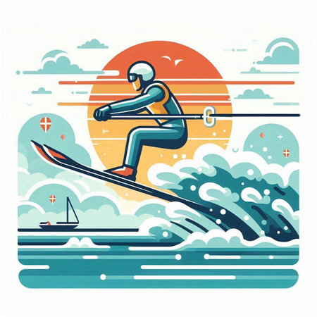 Skiing in the sea. Vector illustration of a man on a board.