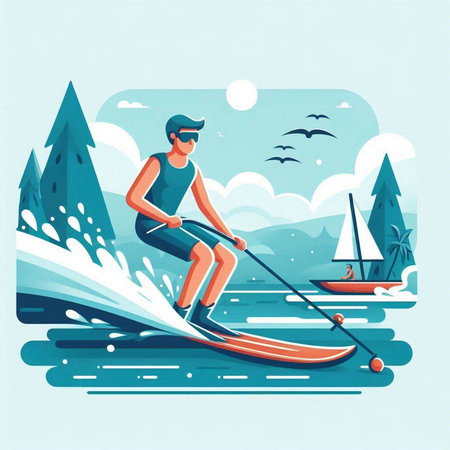 Vector illustration of a man on a water skiing in the mountains.