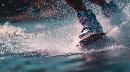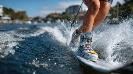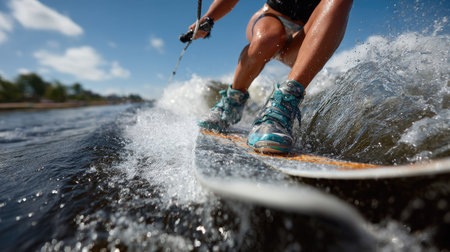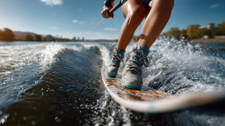 A captivating scene of a water sports enthusiast riding a board on a sparkling lake. The close-up of the feet highlights the thrill and excitement of surfing with dynamic splashes and the natural beauty around.