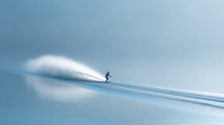 Lone waterskier creates a dramatic spray while gliding across serene blue waters, showcasing skill and excitement in a perfect blend of sport and nature