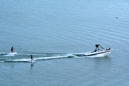 RUA, NZL - JAN 10 2015:Two people water skiing over Lake Rotorua, New Zealand.Water skiing was invented in 1922 when Ralph Samuelson used a pair of boards on Lake Pepin in Lake City, Minnesota.