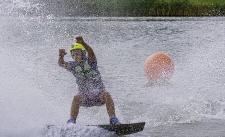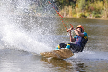 Teenage boy wakeboarding on river. Extreme water sport