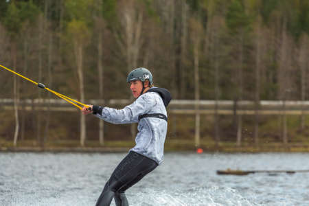 Fagersta, Sweden - Maj 01, 2020: Wakeboarder surfing across a lake.