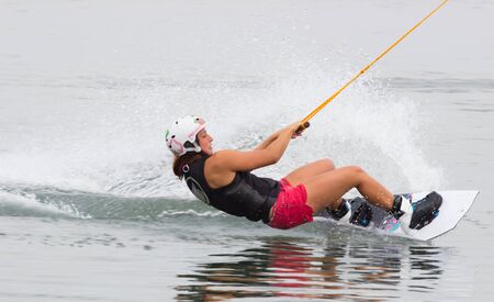 Young athletic woman riding kneeboard on a lake