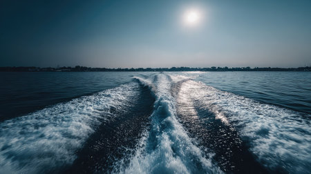 A tranquil scene capturing the water trail created by a boat at sunset, with gentle waves and sun reflections, evoking peace and adventure.
