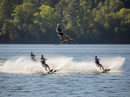 This image captures a thrilling moment of water skiing where three individuals are seen performing stunts on a serene lake. The central figure is in mid-air, executing a jump with precision and style, while the other two skiers glide gracefully across the water, creating dynamic waves behind them. The backdrop features lush green trees, adding a sense of tranquility to the adrenaline-filled scene.