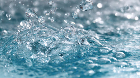 Freezing splashes of water. The texture of water and ice. Clean water on blue background. Dynamic splash of water, captured mid-motion, with droplets suspended in air. Concept is the vitality and purity of water at the moment of the freeze frame.