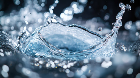 A stunning depiction of water splashing dynamically, highlighted by glimmering light reflections and a soft bokeh backdrop, evoking a sense of freshness and serenity.