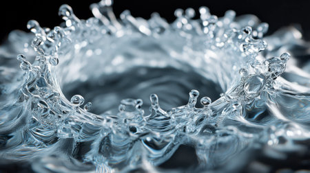 A dynamic splash of clear water on a black background, creating an abstract, fresh, and clean visual, perfect for creative and modern photography