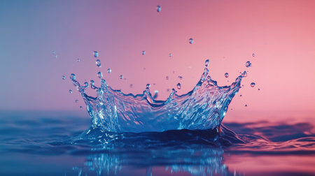 Dynamic splash of water frozen in time, showing fine droplets and fluid motion against a gradient blue and pink background.