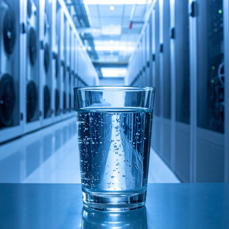 A glass of water with bubbles sits in the foreground of a blue-lit server room. Clear details and vibrant colo...