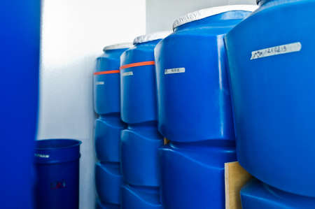 Close-up of rows liquid blue containers on rack in warehouse storage of chemical liquids. Backdrop of storage cans in industry warehouse. Concept of warehousing and stored of goods. Copy ad text space
