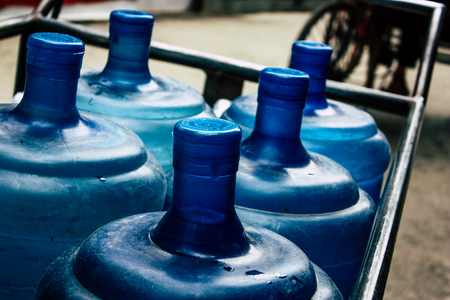 Kathmandu Nepal September 27, 2018 Closeup of jar of water delivered in the streets of Kathmandu in the morning
