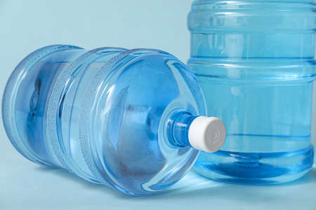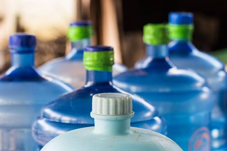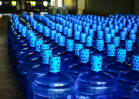 Plastic bottle or tank for drinking water in production line of factory. Process of filling water into plastic bottles to bring out to consumers. gallon drink water manufacturing.