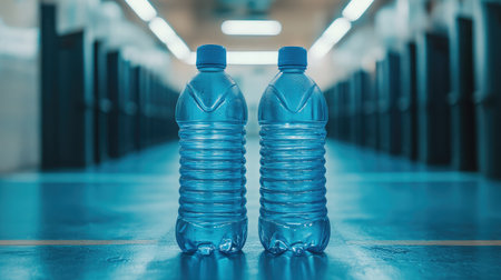 This image features two clear plastic water bottles positioned side by side on a blue surface, conveying a sense of hydration and purity in a modern indoor environment.