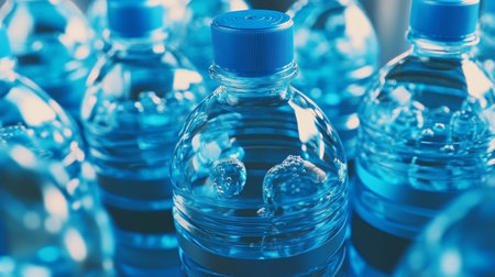 Refreshing Bottled Water in Blue Containers, Ideal for Hydration and Thirst Quenching, Close-Up